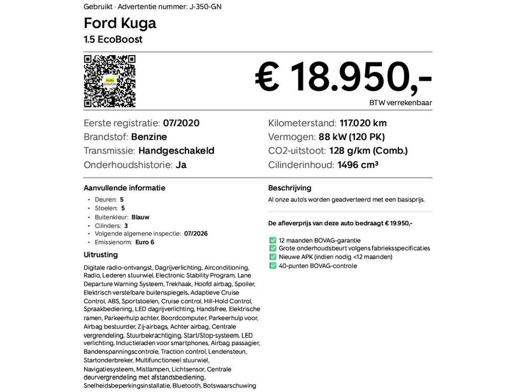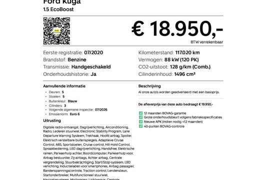 Ontdek deze Ford Kuga 1.5 EcoBoost, een sterke en veelzijdige SUV met original trekhaak (geremd tot 1.600 kg). Deze uitvoering biedt een zeer praktische combinatie: zuinige benzinemotor, voldoende vermogen en voldoende trekcapaciteit voor bijvoorbeeld een aanhanger, caravan of boot. De auto is bovendien comfortabel, ruim en goed onderhouden.