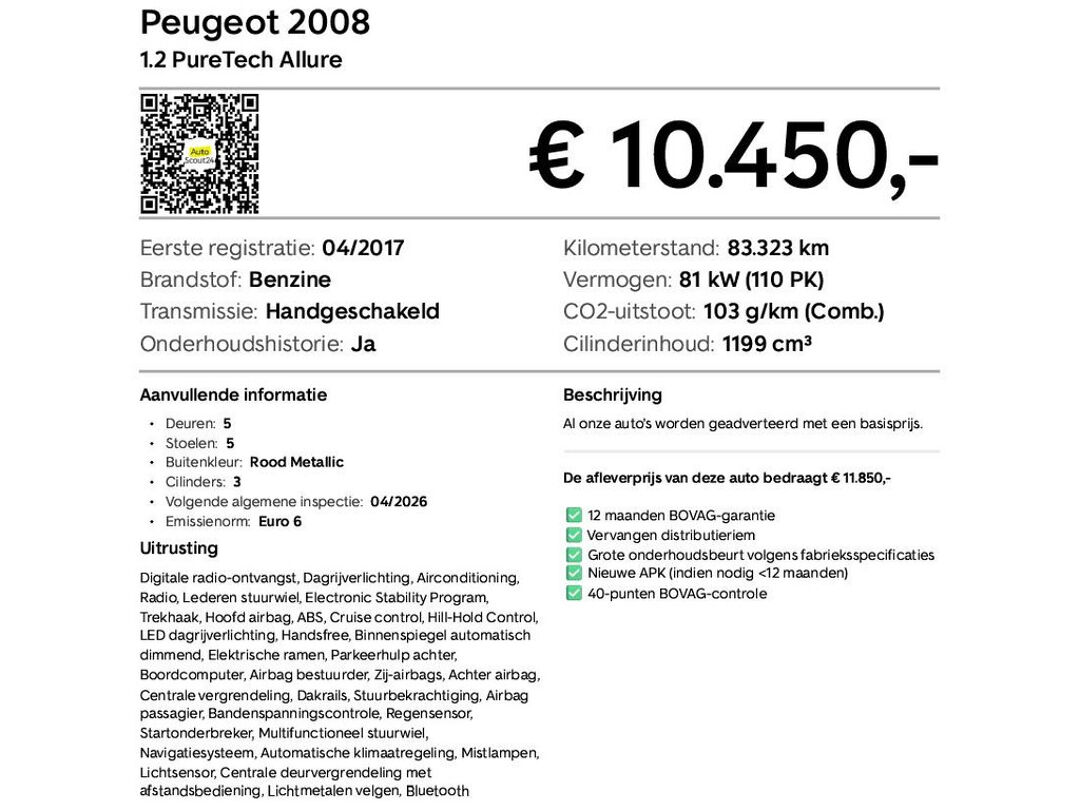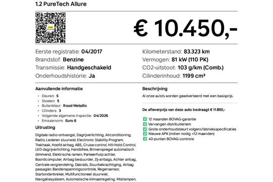 Deze Peugeot 2008 1.2 PureTech Allure is een nette en veelzijdige compacte SUV, ideaal voor dagelijks gebruik én flexibel vervoer. Met de zuinige PureTech-benzinemotor en praktische Allure-uitvoering biedt hij comfort en betrouwbaarheid. Dankzij de trekhaak met een trekgewicht van 1.250 kg is deze 2008 extra praktisch, handig voor bijvoorbeeld aanhanger of fietsen. Kortom: een slimme combinatie van comfort, zuinigheid en praktische inzetbaarheid.