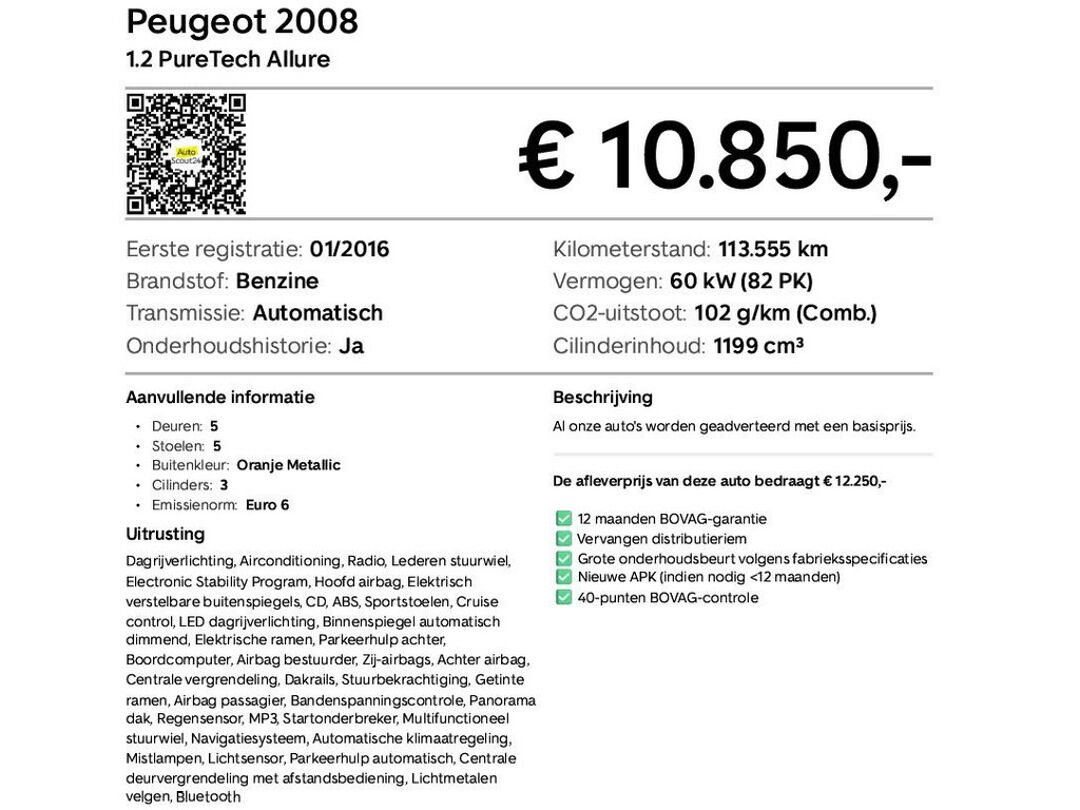 Deze Peugeot 2008 1.2 PureTech Allure Automaat is een nette, complete en comfortabele compacte SUV. Hij rijdt soepel dankzij de PureTech-benzinemotor en de automaat, en biedt prettig overzicht door zijn hogere zit. De auto is netjes uitgerust met o.a. leer en een trekhaak, waardoor hij zowel luxe als praktisch is. Een betrouwbare, zuinige en veelzijdige auto die perfect is voor dagelijks gebruik.