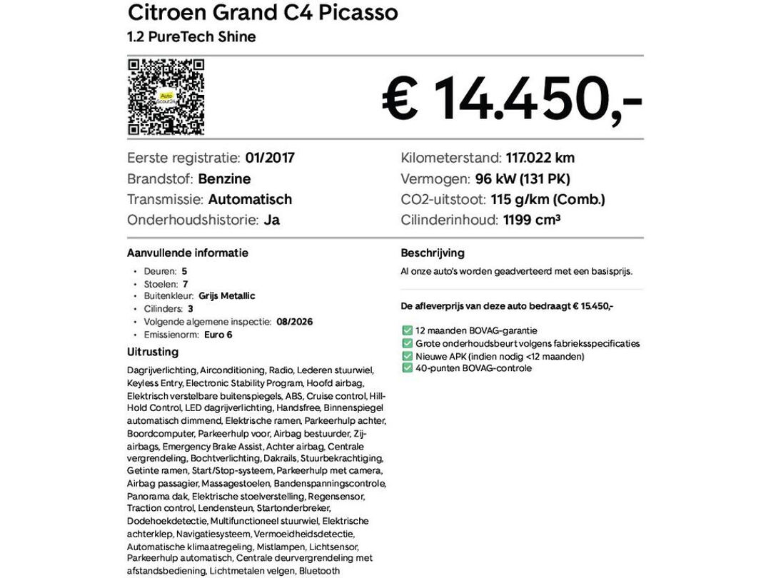 Deze Citroën Grand C4 Picasso 1.2 PureTech Shine Automaat is een ruime en comfortabele 7-persoons MPV met een soepele automatische transmissie en een zuinige PureTech-benzinemotor van ca. 131 pk. De auto is fraai uitgerust met onder meer panoramadak, trekhaak, 3× ISOFIX voor kinderzitjes, achteruitrijcamera en moderne comfort- en veiligheidsvoorzieningen voor een ontspannen rit met gezin of vrienden. Een praktische en veelzijdige keuze voor dagelijks gebruik én langere ritten.
