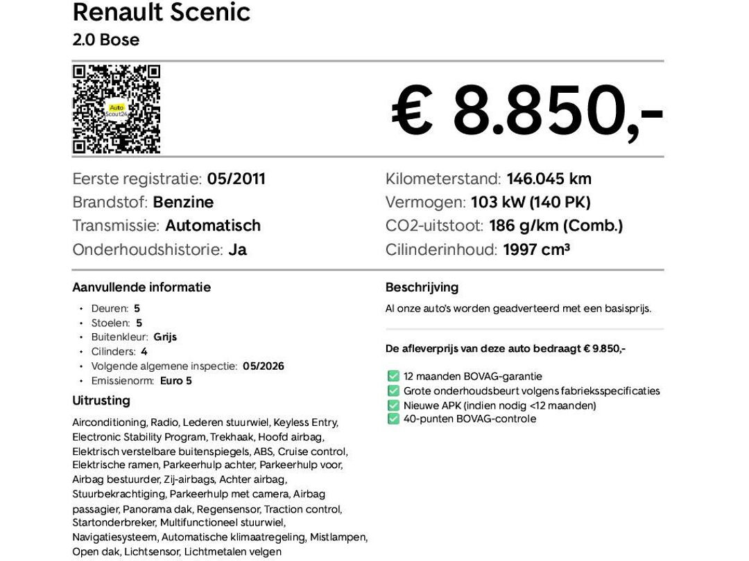 Deze Renault Scénic 2.0 Bose Automaat is een ruime en comfortabele familie-MPV met een soepele automaat en een krachtige, betrouwbare benzinemotor. De Bose-uitvoering biedt een hoogwaardige audio-ervaring en een panoramadak dat het interieur extra licht en gezellig maakt. Met zijn praktische ruimte, comfortabele rit en aantrekkelijke uitrusting is dit een fijne auto voor dagelijks gebruik én langere ritten, een complete en plezierige MPV-keuze.